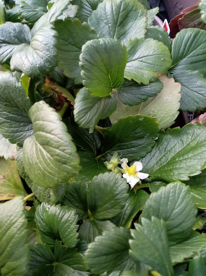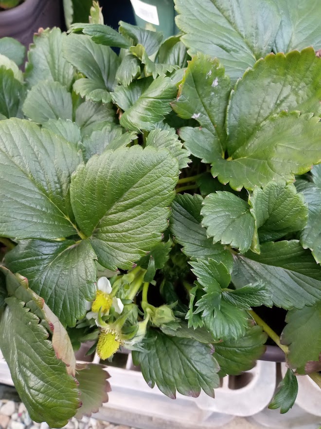 トルコキキョウの手前には、花の咲き出したイチゴのプランターを置きました。
