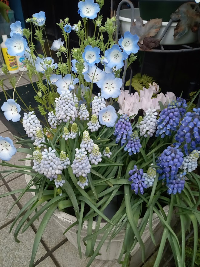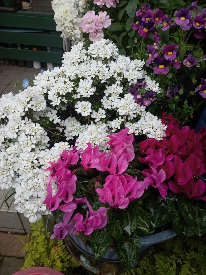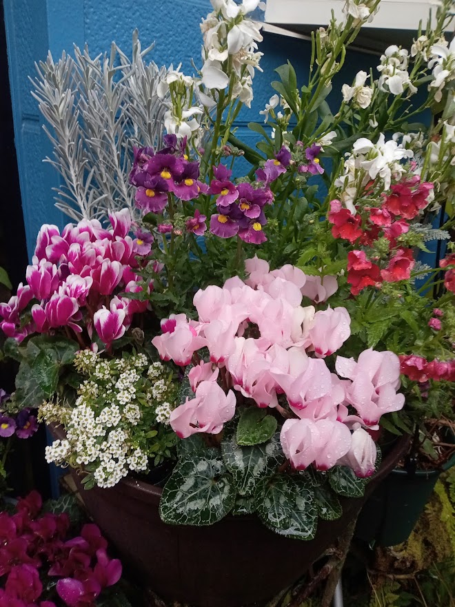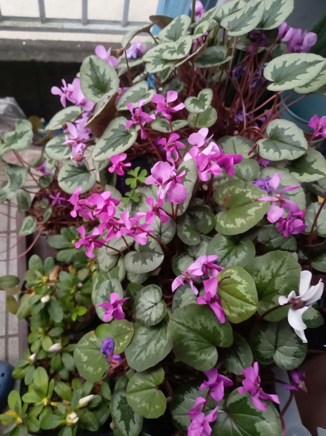 クリスマスの寄せ鉢から使って来たガーデンシクラメンが今が盛りです。クリスマス、正月と彩ってきた他の花は少し疲れ気味の様子です。