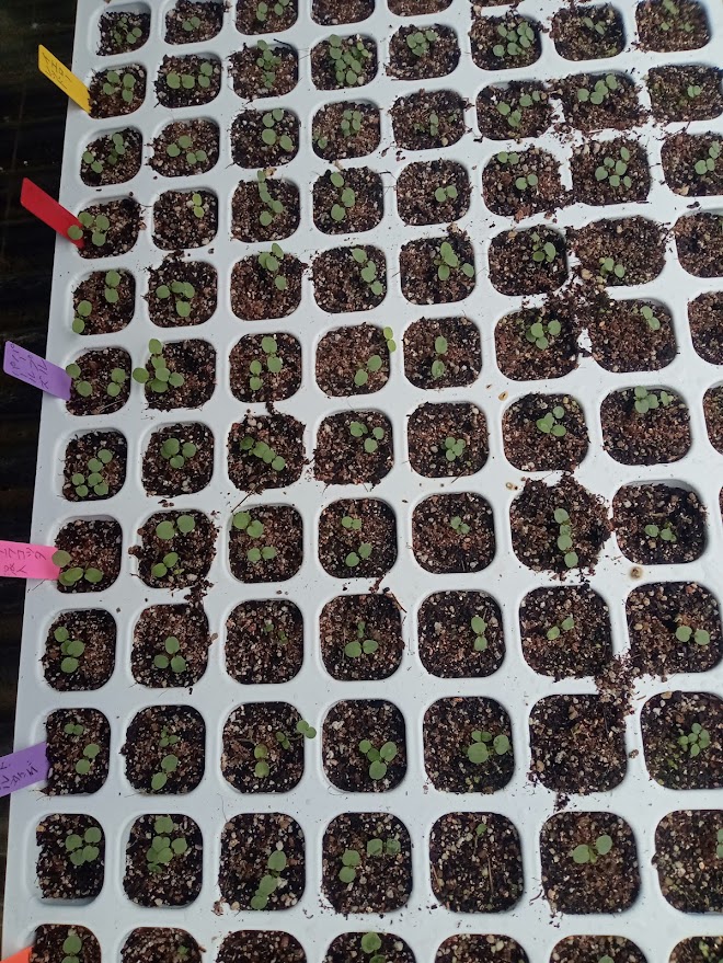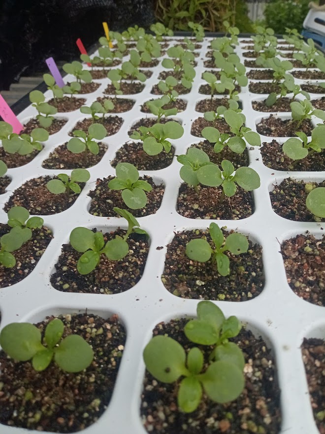 9月20日播種の矮性ストック、1セルに4粒蒔いて八重咲になるであろう苗を1~2本残しています