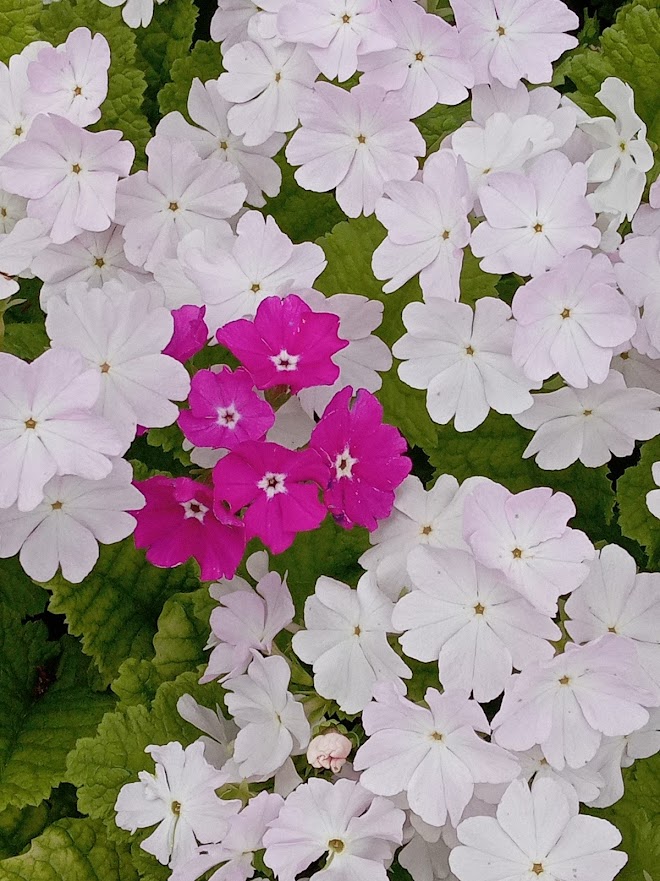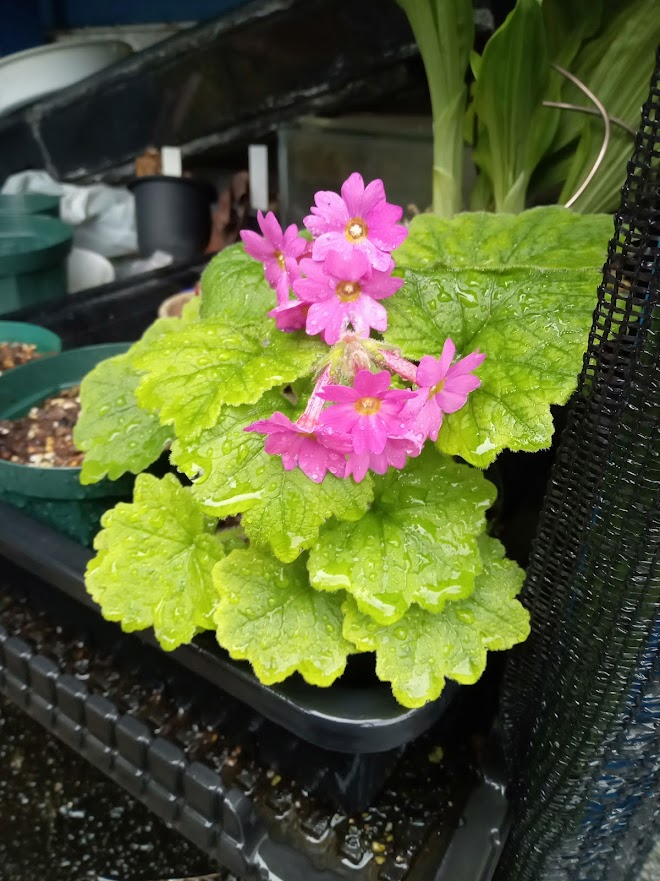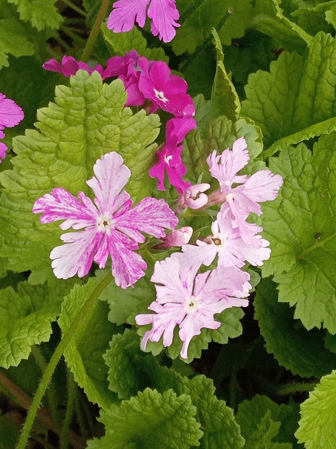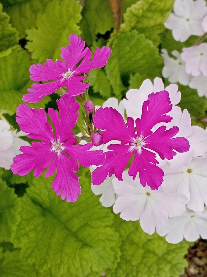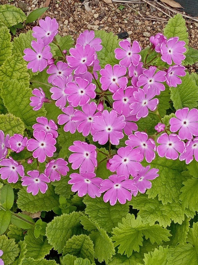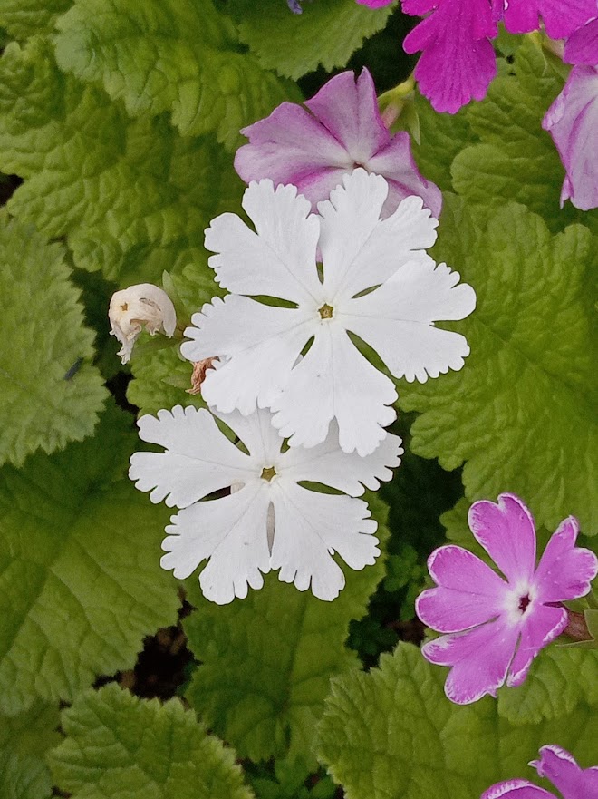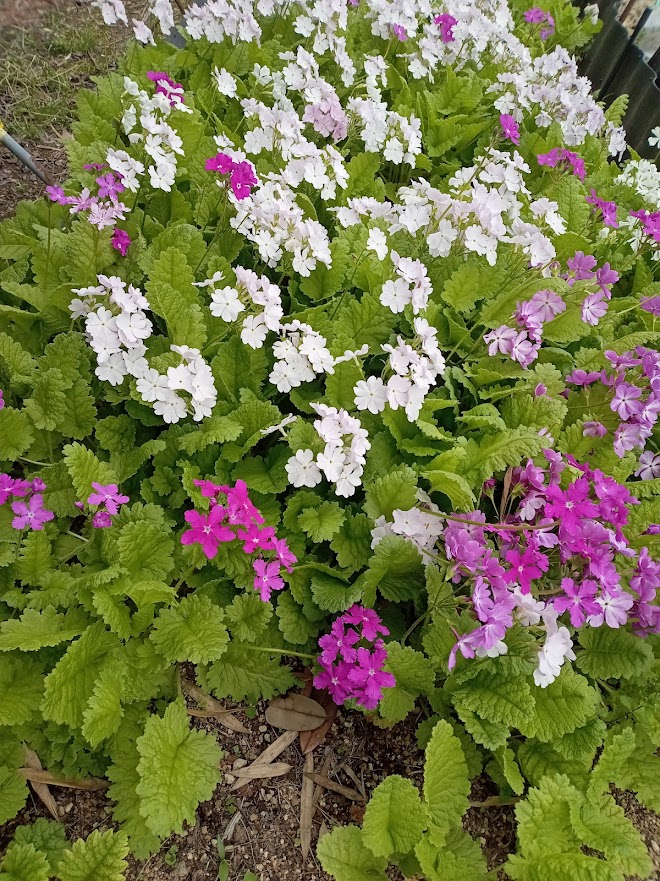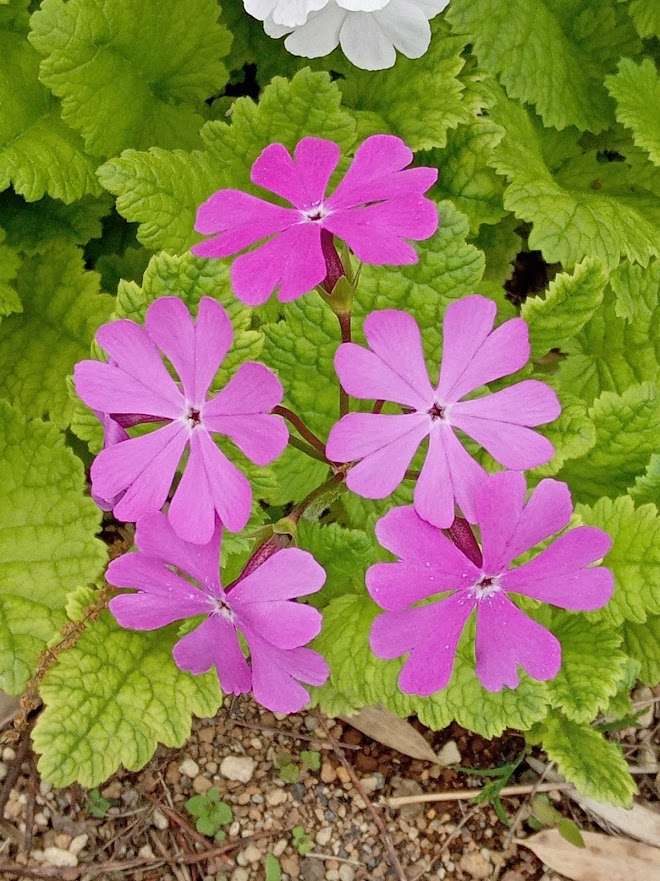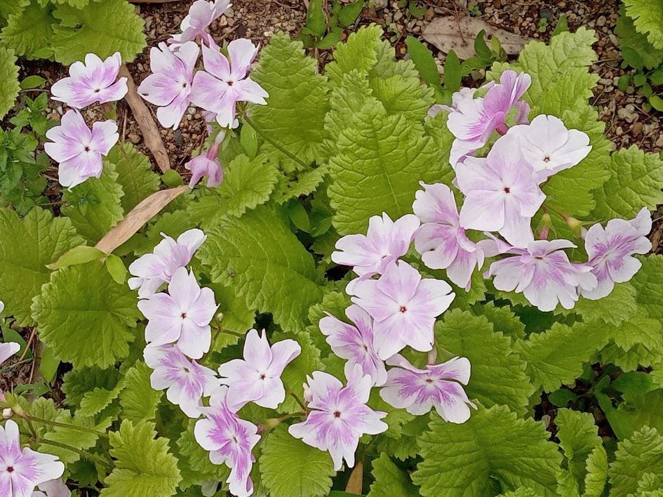 実家の花壇に日本桜草が盛りになっていました。鉢栽培を続けていましたが、夏の管理が難しくなり、5年位前に全て地植えにしました。除草程度の管理で、毎年綺麗に咲いてくれますが、弱い品種は、消えて無くなり、強い品種はのさばって来ています。淡いトキ色(白?)の「駒込」が拡大しています。一番古い園芸品種の「南京小桜」は、咲いていませんでした。