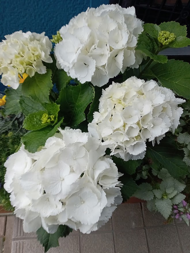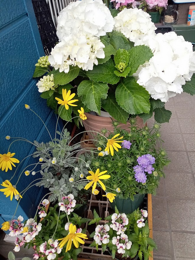 白いアジサイ、ブルーのスカビオサ、黄色のユリオプスデージーで初夏、春、冬の混在です。我が家には、白色のアジサイが無いので、スーパーで900円で出ていたので、購入しました。