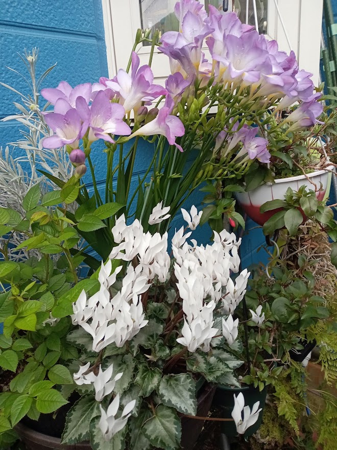 薄紫色のフリージアと白色の原種シクラメン・パーシカム(ペルシカム)